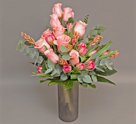 Un buchet elegant și delicat, în nuanțe rafinate de roz, creat pentru a transmite afecțiune, apreciere și bucurie. Combinația armonioasă de trandafiri roz, lalele proaspete și verdeață decorativă oferă un aspect modern și romantic, potrivit pentru orice ocazie specială – aniversări, zile de naștere, mulțumiri sau simple surprize pentru cineva drag.